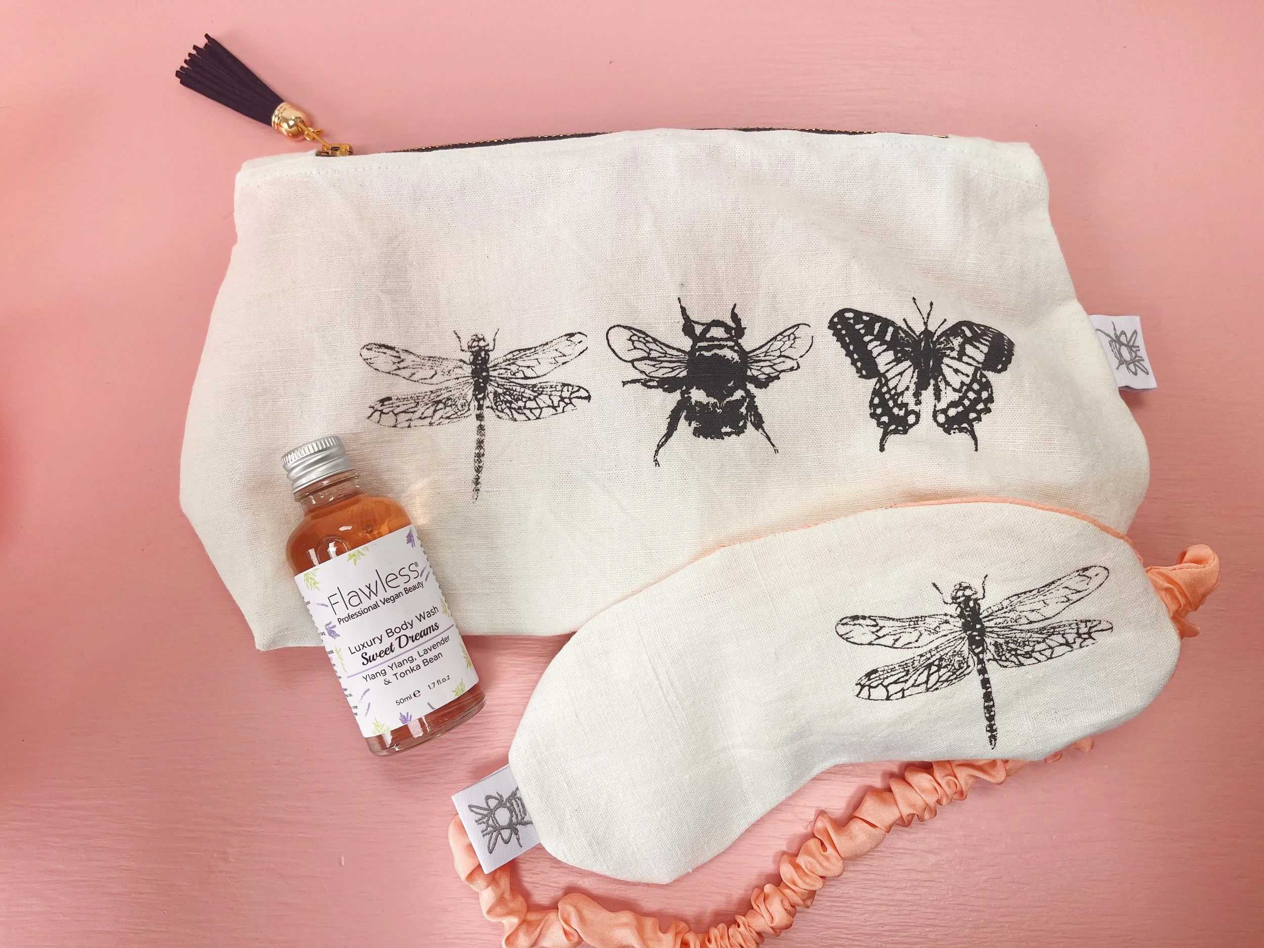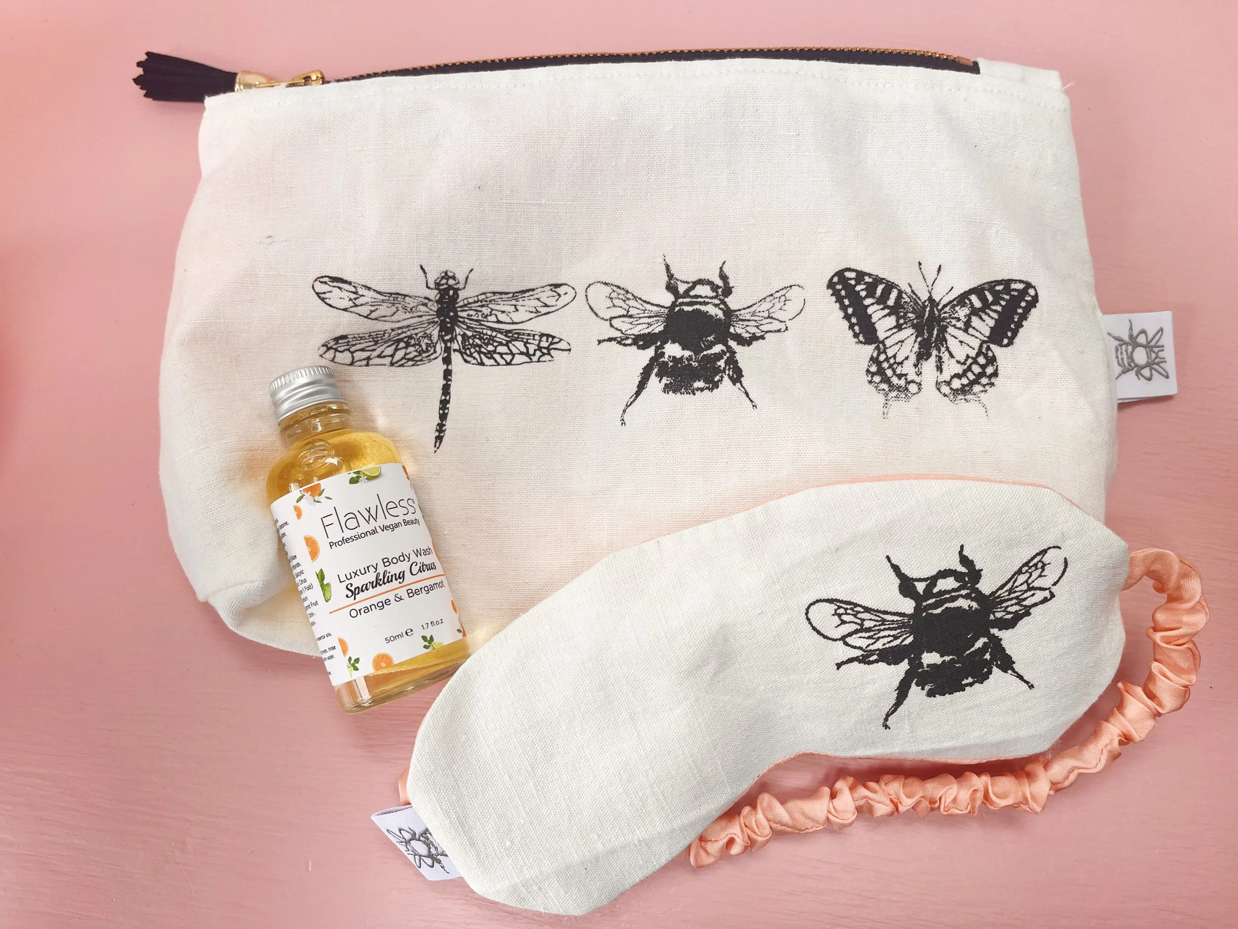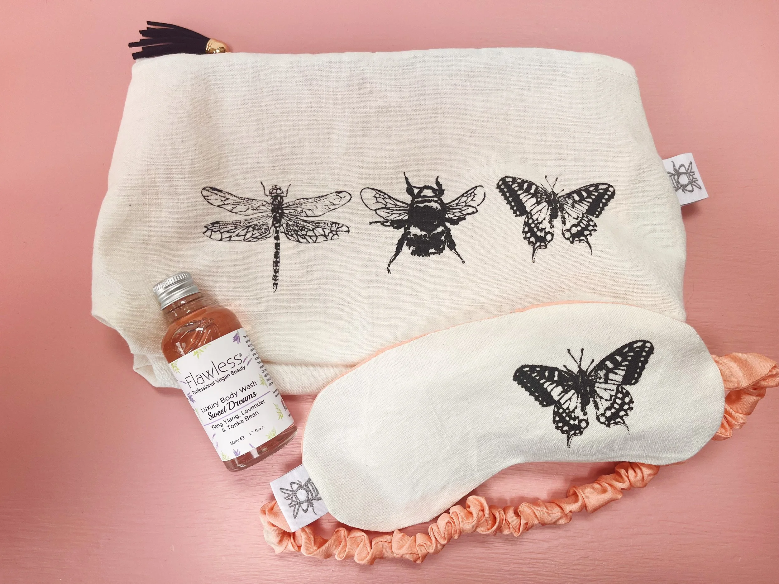 Body Wash - Bee set comes with 50ml Flawless vegan beauty, Sparkling Citrus - Orange & Bergamot. Butterfly & dragonfly set comes with 50ml Flawless vegan beauty, Sweet Dreams - Ylang Ylang, Lavender & Tonka Bean.