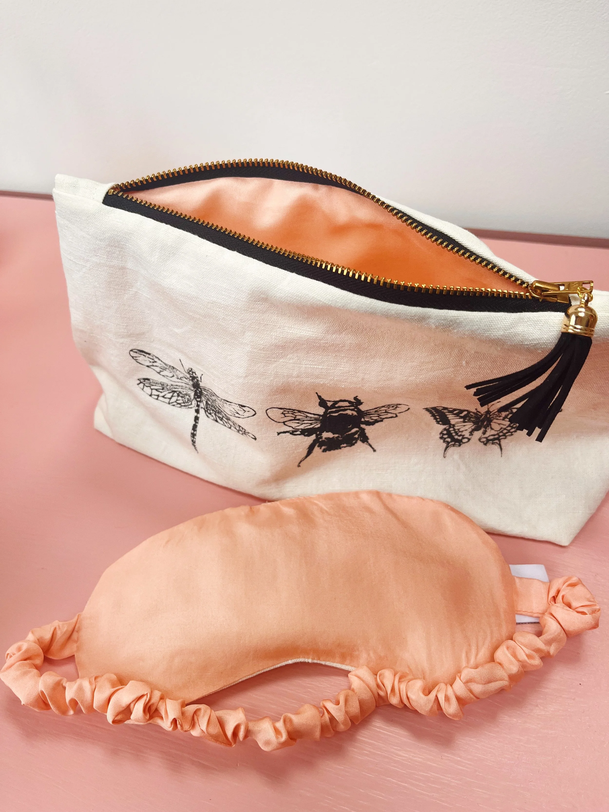 Sleep mask - Vintage cream linen outer shell with black hand printed motif of bee, butterfly or dragonfly. Vintage peach silk lining & head strap.